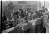 Beg. bilar, Ferieskola, Bodenkille slog rekord 14 juli 1966 En lärare sitter vid sin kateder och skriver på ett papper i ett klassrum. Han är klädd i mörk kostym, mörk slips samt vit skjorta. Framför honom står en ung man och betraktar vad läraren skriver på papperet. I bakgrunden sitter två andra unga män samt en ung kvinna vid varsin skolbänk. De befinner sig på ferieskola.