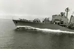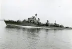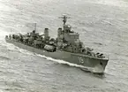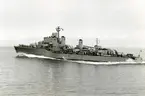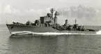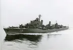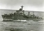 USA:s marinchef på Bergaskolorna. Amerikanske marinchefen Arleigh A. Burke ägnade större delen av fredagen åt den svenska marinen. USA:s marinchef Burke (knäböjande) ombord på jagaren Småland.