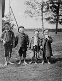 "Fattighjon från Jeppetorp fattiggård." Fyra barfota pojkar i slitna kläder.