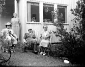 Fyra personer dricker kaffe i trädgården. Stugan sannolikt belägen vid Nordkroken, Vargön.