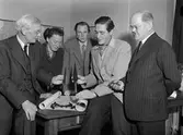 "Båtgravar i Valsgärde berättar om storbondesläkt i Fullerö" - professor Sune Lindqvist, arkeologerna Else Nordahl, Bengt Schönbäck och Björn Allard samt preparator Hilmer Gelin, Museet för nordiska fornsaker, Uppsala 1948