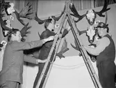 Stadsbuden Jansson och Gustafsson hänger upp älghorn med hjälp av godsägaren P J Högfeldt j:r i Uppsala Läns Jaktvårdsförenings jubileumsutställning på Östgöta studentnation