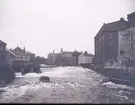 Motala ström i Norrköping med kallbadhuset. Stora byggnaden är Tuppens bomullsväveri.