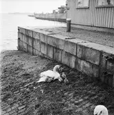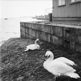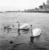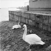 Knölsvanar och sothönor vid Strömgatskajen. Vy mot Strömbron.