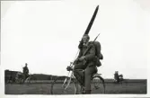 "Regementets fana. Lång-Johan". En man i uniform på cykel med regementets fana på axeln.