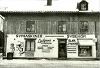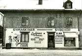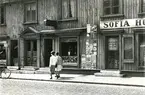 En tvåvåningsbyggnad med locklistpanel. Tre kvinnor i förkläde står i närmaste entré under skylt: "E. Magnussons Matvaruaffär" Flera fönster, vädringsfönster, står öppna. I borte entrén står en man under skylt: "H. Rosenborg & Co. Sybehörshandel".