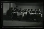 Varbergs Skofabrik. Sju interiörbilder och bilder av personalen. Fabriken låg i kv Vindragaren, på Sveagatan 31-33. Bild 1: Skolager. Ragnar Larsson heter mannen utan glasögon. Bild 2: Sömmerskor vid symaskinerna i fabriken. Bild 3: Fem män som arbetar med tillskärning av skinnen. Bild 4: Maskiner och personal som formar och sular skorna. I taket hänger skoämnen i klasar. Mannen till höger i ljus skjorta heter Tage Karlsson, Falkenberg. Bild 5: Tillskäraravdelningen, mallar till höger. Bild 6: Samma avdelning som bild 4. Bild 7: Personalmatsalen under matrast.
