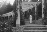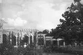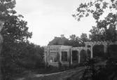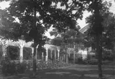 Skioptikonbild med motiv av terrassen på Hotel Bosque. Bilden har förvarats i kartong märkt: Höstresan 1910. Granada 2 . Hot. Bosque 9. N:28. Text på bild: "Terrass å Hotel Bosque".
