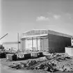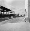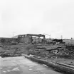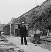 Bilden visar en sjöman med skyddskläder och flytväst stående mellan byggnader på Gålö.