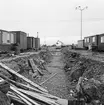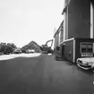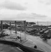 På bilden syns en gata och byggnader på Gålö. Mellan byggnaderna har man utsikt över skärgården i bakgrunden och man ser en flertal sjöman.