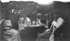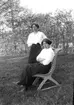 En person i randig klänning och schalett och Astrid Wilander i knälånga byxor. Möjligen är de utklädda.