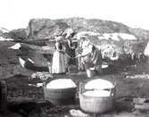 TRE KVINNOR VID EN STOR TVÄTTBALJA I BRYGGHUSET.