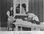 Till vänster "Jumblas"-Kristin Edlund från Voxsätter 13:5, född 1873, och till höger Målar-Elin (Nilsson), född 1893, som tvättar vid Voxnan. Bilden troligen tagen 1915.