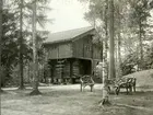 Två män som sitter utomhus och samtalar utanför ett pensionat med skymt av en sjö i bakgrunden (troligen Siljan). Text i album: "Johanssons Pensionat, Tällberg 1925".