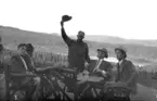 En grupp män med uniformer som sitter och samtalar. Text i album: "Middag för tyska sjöofficerare å Elfkarleö, sommaren 1926".
