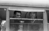 "Karantänsförläggning" på Kvarnbyskolan för flyktingar från koncentrationsläger i Tyskland 1945. Två män som tittar ut genom ett bussfönster.