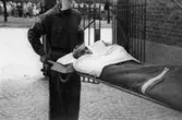 "Karantänsförläggning" på Kvarnbyskolan för flyktingar från koncentrationsläger i Tyskland 1945. En manlig flykting på bår buren av en Röda Kors-personal.