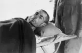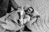 "Karantänsförläggning" på Kvarnbyskolan för flyktingar från koncentrationsläger i Tyskland 1945. På båren ligger Abraham, 22 år gammal, flykting från koncentrationslägret Bergen-Belsen i Tyskland.
