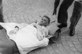 "Karantänsförläggning" på Kvarnbyskolan för överlevande från koncentrationsläger i Tyskland och Polen 1945. En Röda Kors-medarbetare bär en bår. På båren ligger en okänd överlevare från koncentrationsläger i Tyskland. Skolan fungerade under denna sommar som beredsskapssjukhus.
