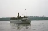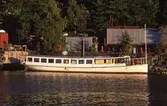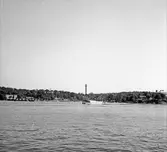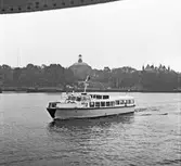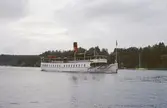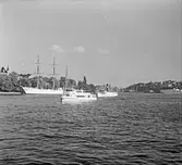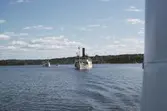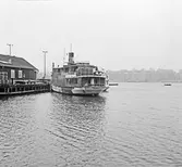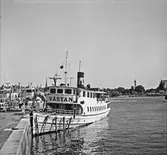 En kvinna stiger ombord på en Waxholmsbåt. "Från Tenösund, Anna måste fara, Att i Stockholm allt väl klar"...[svårläst].Teckning av Fritz von Dardel.