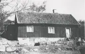 Gammal gård nära Lerkil i Vallda. Bostadshus och ladugård med utedass. Farstun till bostadshuset har välvt tak.