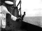Fotografi från låda märkt Bernt Balchen. Balchen var norsk-amerikansk flygare, polarforskare och militär. Motiv av brevbärare som ger väska med post till en besättningsman på båt.