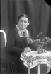 Porträtt av en ung kvinna i ljus klänning som står lutad mot en piedestal med blomvas.