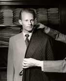 "Stilenco". Herrmode, Nordiska Kompaniet. Man hos skräddare provar kritstrecksrandigt kostymtyg.