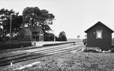 Vägstation S8, Deje. Garagebyggnad. Spetsplogar och sidoplog framför byggnaden. Bensinpumpar (drivmedelspumpar). Bostadshus i bakgrunden.