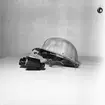 En soldat står vid en luftvärnskanon och kolla på havet med en kikare.