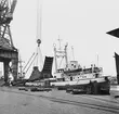 Oskarshamns varv.Bilden visar MF TÄRNFORS vilande på blockan. Till vänster på bilden, likaså höger, stöttar som håller fartyget i rätt läge.