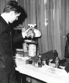 Tekningslärare Breitholz. Träfigurer i form av en pingvin och en man.