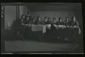 "Broderingskurs, Frida med kamrater." En grupp kvinnor arbetar vid symaskiner.