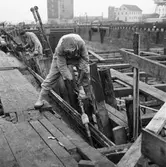 Gjutningsarbeten vid Diös-bygget i kvarteret Blocket i Sandviken, oktober 1953. Vid gjutningsarbetet användes bl.a. "Specialformluckan" tillverkad av plywood från fabriken i Ljusne.
