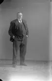 Kabinettsfotografi av en okänd ung man med mustasch, kravatt och klockkedja. Han står med händerna i byxfickorna.