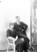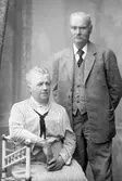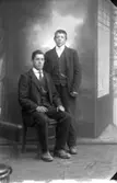 Två bröder i smårutig kostym står intill varandra. Den äldre med fluga och klockkedja håller vänster hand på lillebrors axel.