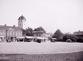 Enligt tidigare noteringar: "Torget i Uddevalla. Stor lycktstolpe "Kandelaber". I bakgrunden Klocktornet. Mitt i bilden torghandel."