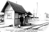 Vägstation R9, Lidköping. Förrådsbyggnad. I bakgrunden garagebyggnaden och kontorsbyggnaden. Mellan byggnaderna lastningselevator (skopelevator), luttunna, plogsfäste för sidoplog. Täckdikningsrör, stör till snöskärmar.