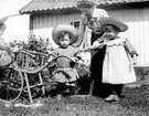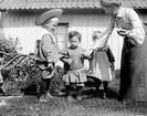 Långåker, nedanför ladugårdarna. Till vänster Nikolina Andersson, Långåker f. 1876 d. 1961. Till höger sommargästen Stina Eriksson, Bergås, Hallen f. 1906 d. 1967 med sonen Bo f. 1930 d. 2011.