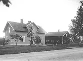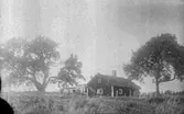 NÅGRA PERSONER MED HÄST OCH CYKLAR VID UTHUS.