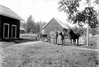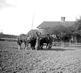 Axel Eriksson (1877 - 1958) och sommargäster står ute på åkern med två förspända arbetshästar, "Store Börjes" Heljered Mellangård 1:2 1930-tal.