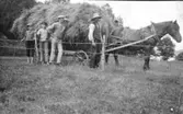 Höbärgning 1940-tal. Från vänster Anders (1873-1951) och Hilda Sandberg (1887-1973) samt en okänd man, "Sandbergs" Sagered 3:3 1940-tal. Två arbetshästar står med.
