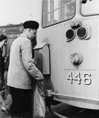 Poststationsföreståndaren fru Gulli Öding, Möja poststation, transporterar posten till ångbåtsbryggan vid Berg, varifrån den förs med 16.30-båten till Kalvsvik och därifrån med buss till Stockholm. Fyra dagar i veckan går posten kl 16.30 och två dagar kl 04.30.