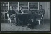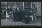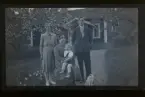 "Vi, Anna, Nils och Elsa Råstedt och Annie" Ett sällskap (fotograf Axel Fredriksson och frun Frida Fredriksson liggandes) porträtterade i ett kök.
