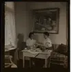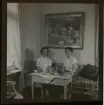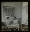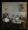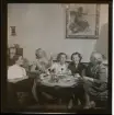 513 D Spooners Hemma hos redaktör Karlströmer. Ett sällskap sitter runt ett soffbord dukat med kaffekoppar. Runar Karlströmer visar de andra något i ett magasin.