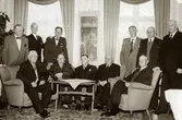 Skara läroverk. Gymnasistbal på Stadshotellet i Skara våren 1956 tillsammans med äldre skaradjäknar: Från vänster: Två värdar, major John Lindgren, tandläkare Sven Sahlberg, rektor Höijstad, köpman Georg Wilsson, ryttmästare Paul Jönsson, överste Ragnar Millqvist, två värdar, Bo Stohlander och ? Sittande: Överste Bursie, fru Märta Thell, fru Sahlberg, fru Beth Kuylenstierna, fru Höijstad, fru Ninnie Lindgren, fru Eivor Millqvist och fyra värdinnor.