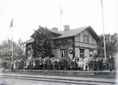 EXTERIÖR AV GÅRDSJÖ STATIONSHUS MED ELVA JÄRNVÄGSTJÄNSTEMÄN UPPRADADE PÅ PERRONGEN FRAMFÖR STATION. OKT. 1913.