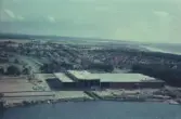 Flygfoto över Nybro. De två bilderna visar dels den obeskurna kopian, dels det beskurna vykort som blev resultatet.