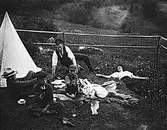 Kvinnor, barn och män sittande på en bil som står på en äng. Kållered 1930-tal.