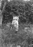 Jordbrukare och biodlare Paul Eriksson står på ängsmarken vid Heljered Mellangård "Storebörjes", okänt årtal. Född 1913 på mellangården, död 2005 på mellangården.